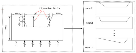 In order to investigate the sensitivity of the 2D seismic response of trapezoidal basins to various parameters related to basin geometry and sediment properties, an extensive numerical analysis of homogeneous soil basins with linear viscoelastic soil behavior was carried out. The parameters and models were selected mainly with reference to the parameter ranges of the literature [24] while considering the characteristics of the physical parameters of the site as specified in the Chinese Seismic Code, and similar works were found in the literature [25,26,27]. Homogeneity and viscoelastic behavior were chosen as reference assumptions for the numerical models, which is a common practice in such studies [24]. The surface ground motion was simulated in batch by the finite element software ABAQUS, and the specific analysis process was described in the previous subsection, similar simulation processes were found in the literature [25,27,28]. This paper focused on the amplification characteristics of small and medium-sized basins, which span less than 3000 m. The influence of incident angle and incident wave frequency was not considered in this study. In order to reduce boundary errors, the bedrock was set laterally to 800 m from either side of the basin, and the overall height of the model was unified as 500 m. The range of soil properties in the basin was controlled within a reasonable variation, so as to satisfy the richness of the basin geometry and medium parameters. Based on the adjustment of basin shape and physical–mechanical parameters, a large number of basin models were formed. Table 1 summarizes the main geometric and dynamic properties of all the models, which refer to four groups of shape ratios, each corresponding to two depth cases of 200 m and 300 m, and a total of eight combinations, with limit angles for the dip angle under each combination, generating a total of 756 basin models, including the asymmetric case where the dip angle is unequal on both sides.