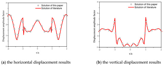 As can be seen from the comparison results of the surface displacement amplitudes in Figure 10, the calculated results in this paper were basically consistent with those in the literature [31], indicating that the artificial boundary adopted in this paper could smoothly absorb the external scattering propagation to avoid reflection errors, and the corresponding ground motion input was successfully realized.