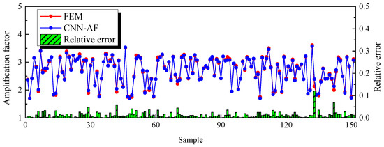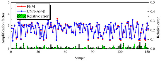 The prediction models in the previous two sections show that CNN can be used for either single or multiple outputs. In this section, the peak value of the amplification factor, which reflects the basin amplification characteristics, was combined with the hazard locations as the outputs of the prediction model. The eight parameters of the CNN-AF were used as the input of the CNN-AP-8, and the model output was based on the CNN-AF amplification factor peak output while considering the value of the hazard location. Figure 16 shows the relative error of the CNN-AP-8 model in predicting the amplification factor, which was below 10 percent for all 151 samples tested, and the evaluation indicators are shown in Table 8.