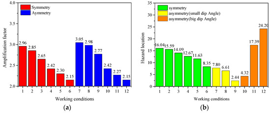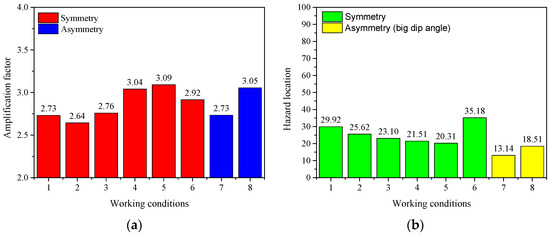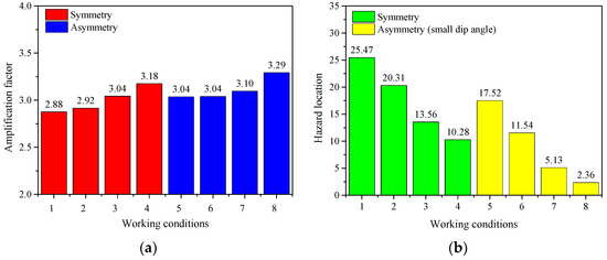 The significant difference in hazard location between symmetrical and asymmetrical configurations in the first two sections reflects the effect of the inclination angle. In this section, we only modify the inclination angle to perform sensitivity analysis, and each working condition is presented in Table 10. Regarding the amplification factor, as shown in Figure 19a, the effect of the inclination angle is not obvious, and there is only a positive correlation within a certain range. In the case of asymmetry, through the analysis of working conditions 2 and 7, as well as working conditions 5 and 8, it is apparent that the amplification factor is closer to the symmetrical case of a large dip angle. In terms of hazard location prediction, as shown in Figure 19b, when the dip angle is less than 80°, the hazard location is closer to the center of the basin as the dip angle increases. Similarly, in the case of asymmetry, by analyzing working conditions 2 and 7, as well as working conditions 5 and 8, we can see that the hazard location, in this case, is closer to that in the case of symmetry of a large dip angle.