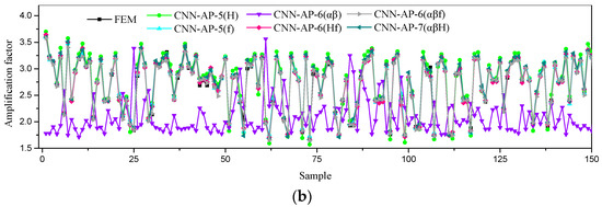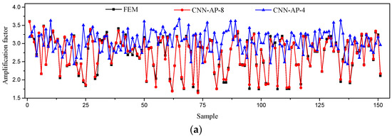 The results of amplification factor predicted by different models. (a) Comparison of prediction results between CNN-AP-4 and CNN-AP-8. (b) Comparison of prediction results of prediction models with different input parameters.