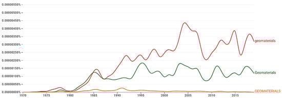 Use of the word ‘Geomaterials’ in English language books. Vertical axis is the fraction of the books examined by the GoogleTM n-gram generator (21 July 2023. https://books.google.com/ngrams/) per month, plotted against time.