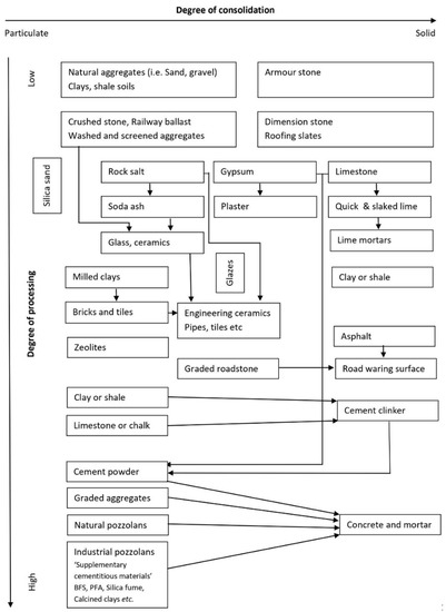 Figure 4 considers the major groups of geomaterials in terms of both their degree of consolidation and degree of processing. At the simplest level, unprocessed materials constitute the greatest proportion of geomaterials in use. Earth works, highway construction and excavation consume vast quantities of unconsolidated soil, aggregates and rock-fill, emplaced and compacted with long service lives in mind. An understanding of the mineralogy of such massive engineering projects ensures the risk of, for example, ground heave as a result of oxidation of pyrite in rocks may be minimised. Mineralogical instability is turned to advantage, however, in highway construction, where minerals in the igneous rocks used as road stone weather at different rates, ensuring the wear from vehicle tyres exposes fresh surfaces and maintain a high coefficient of friction between the tyre and the road. This gives rise to the concept of ‘Polished Stone Value’ (PSV) addressed in current standards for aggregates (e.g., BS EN 932 1997) [8].