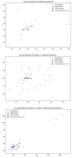 Toy problem ground truth localisation. This plot shows the final location of the proposed method for the desired groups compared to the canonical ground truth and the global mean. The dotted line shows the path taken by over each iteration to its final location. Figure (a) shows the results for the expert group only, (b) the expert + crowd groups and (c) all simulated data.