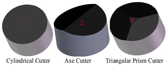 Investigating and optimizing the performance of PDC cutters with diverse structures is a proven approach to enhancing drill bits’ overall lifespan and efficiency [7]. As a result, numerous researchers have devoted significant efforts to exploring the rock-breaking characteristics of PDC cutters with various structures and assessing their suitability for specific formations, with particular emphasis on non-planar cutters [8]. Dong et al. [9] conducted a study on the rock-breaking characteristics and efficiency of circular cutters, axe-shaped cutters, angled cutters, wedge-shaped cutters, and triangular prism cutters through experiments combined with numerical simulation methods. Their results showed that the axe cutters have better drilling ability in hard formations and are suitable for the front row of the cutter blade of the PDC bit, while the angled cutters are more suitable for auxiliary rock breaking and should be installed in the back row of the cutter blade of the PDC bit. Conical PDC cutters are mostly used for auxiliary rock breaking in PDC bits [10,11]. Li et al. [12] used the finite element method to numerically simulate the rock-breaking process of conventional PDC cutters, conical PDC cutters, and the overall rock-breaking process of the drill bit, and the results of the study showed that the conical cutters as auxiliary cutting structures could well produce pre-breaking of rocks at 100 MPa compressive strength, thus improving the overall drilling ability of the bit in hard rocks, while this approach was not effective for rocks with 50 MPa compressive strength. The axe PDC cutter not only has the characteristics of a conventional cutter’s shear breaking in the rock-breaking process but also has a crushing effect on the rock, which can significantly improve the ROP and mechanical specific energy (MSE) of the drill bit [13,14]. The distinctive ridged structure of the axe PDC cutter not only reduces the weight of the drill bit but also optimizes rock-breaking efficiency. Research has shown that a drill bit equipped with an axe cutter can achieve an instantaneous rate of penetration (ROP) that is up to 35% higher compared to the same input energy applied with other cutter designs [15].