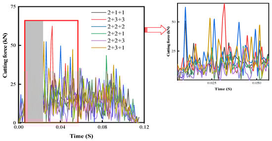 To find the best cutter arrangement scheme, 18 different combination schemes of cylindrical (No. 1), axe (No. 2), and triangular prism (No. 3) cutters were numerically simulated. The scheme numbers in Figure 10, Figure 11 and Figure 12 have the following implications: Taking “1 + 2 + 2” as an example, the first digit represents the cutter arrangement type of the front row of the drill bit. The second and third digits represent the cutter arrangement types of the rear row of the drill bit, with the second digit indicating the left-side cutter arrangement type of the rear row and the third digit indicating the right-side cutter arrangement type of the rear row. The cutting force curves corresponding to the six strategies utilizing cylindrical cutters in the frontal row are shown in Figure 10. As evidenced in the figure, the application of cylindrical cutters as the leading row has a considerable impact on the overall cutting force under varying rear row arrangements. In instances where the rear row incorporates a cylindrical cutter, the cutting force exhibits a notably amplified peak and fluctuation compared to the other arrangements.