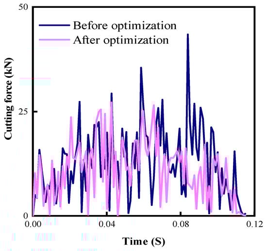 Drawing from the correlation between the gleaned design variables and the target quantity and with an objective to optimize the minimum mean cutting force, an optimized mean cutting force of 11.68 kN is achieved when the resultant longitudinal distance 1 measures 10 mm, longitudinal distance 2 records 10.06 mm, and transverse distances 1 and 2 both equal 7 mm. A numerical simulation of the rock-breaking cutter based on the established parameters and its comparison to the cutting force from the pre-optimized scheme are shown in Figure 17. The data reveal that the peak and fluctuation in cutting force exerted by the optimized cutter during the rock fracturing process are considerably smaller than those experienced prior to optimization. This suggests that the optimized cutter design encounters less resistance, thereby demonstrating enhanced effectiveness in the rock-breaking process. The average cutting force exerted by the optimized cutter is computed to be 10.96 kN, which signifies a reduction of approximately 13.7% in comparison to the 12.7 kN experienced before optimization. Furthermore, the deviation between the optimized forecasted value and the simulated value is merely 6.2%, thereby affirming that the derived mathematical model is significantly reliable.