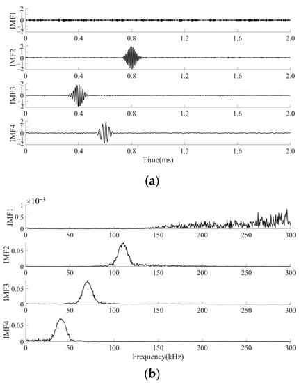 The AE signal can be viewed as a composition of multifrequency information []. By decomposing the AE signal, different frequency components can be obtained, allowing for the more precise extraction of time–frequency characteristics after noise frequency filtering. Numerous methods have been developed for AE noise reduction, including fast Fourier transform [], wavelet decomposition [], wavelet packet decomposition [], empirical mode decomposition (EMD) [], and local mean decomposition []. However, fast Fourier transform is limited to stationary signal analysis, providing only frequency components within a signal segment and demonstrating poor performance with nonlinear signals []. Wavelet decomposition and wavelet packet decomposition can better deal with nonstationary signals, but it is necessary to select a suitable wavelet basis before signal decomposition. Although the EMD and local mean decomposition methods are adaptive techniques without the aforementioned limitations, they still encounter mode mixing and end effects in practical applications.