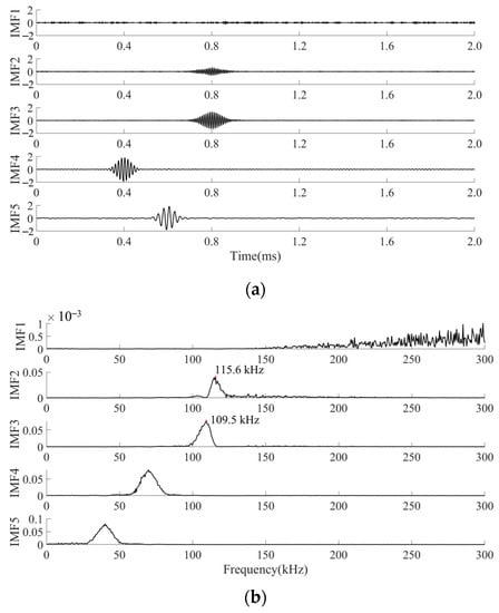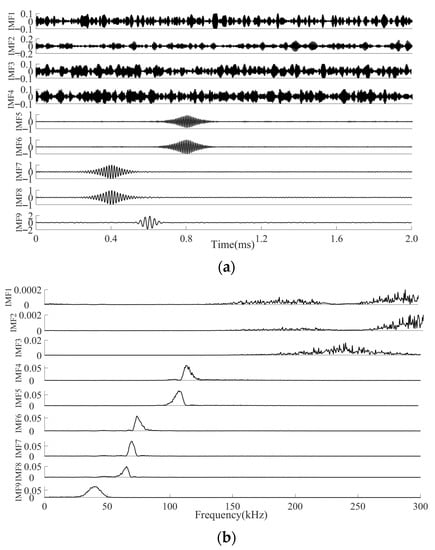 The modes obtained using EMD, with k = 9, IMF1~IMF5. (a) Distribution of different waveform components. (b) Spectrum of different waveform components.