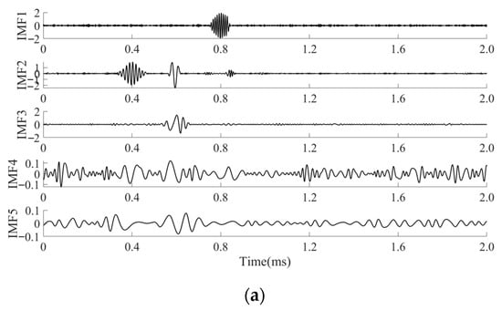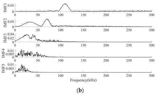 After determining the value of k using the FCI-VMD algorithm, the simulation signal is decomposed using VMD with a selected number of decomposition layers, namely, k = 4 (see Figure 2). The spectrogram reveals that IMF2, IMF3, and IMF4 correspond to the main frequencies = 110 kHz, = 70 kHz, and = 40 kHz, respectively. In contrast, the IMF1 component exhibits a wider frequency band with high frequency and low energy, indicating it as the noise signal. To verify the effectiveness of the proposed optimization algorithm, we also decompose the signal with k = 5 using VMD, and the resulting components are shown in Figure 3. Notably, the main frequencies of the IMF2 and IMF3 components in Figure 3 are found to be relatively close, indicating the occurrence of mode mixing. Consequently, the optimal number of decomposition layers, k, for the signal is determined to be 4.