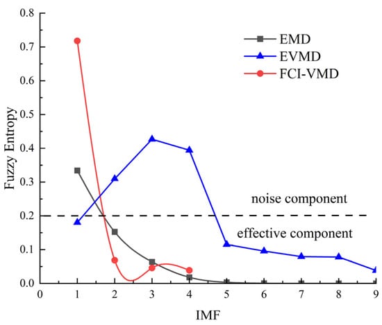 Entropy serves as a metric for assessing the complexity of a signal. with higher entropy indicating greater complexity. Using VMD decomposition, the AE signal is separated into several components with distinct characteristic frequencies. A higher entropy value signifies a more chaotic nature of the signal. In comparison to the effective signal, the AE noise signal exhibits heightened complexity and uncertainty, resulting in higher entropy. Consequently, in this section, fuzzy entropy is employed to eliminate noise components from the AE signals.