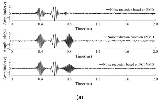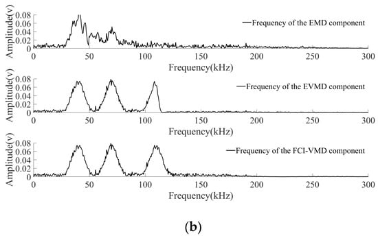 Figure 7 depicts the denoising results obtained with the EMD method applied to a noise-contaminated analog AE signal. It can be observed that the 110 kHz frequency signal is filtered out, leading to waveform distortion. This indicates that filtering the complex simulation AE signal using EMD decomposition compromises the integrity of the effective signal. Conversely, upon decomposing the simulation AE signal using FCI-VMD, the desirable frequencies of 40 kHz, 70 kHz, and 110 kHz are successfully extracted, allowing for the separation of noise and effective signals.