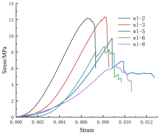 All the coal samples tested are taken from Wanglou Coal Mine, Shandong Province, China. All samples are prepared in accordance with the ISRM-suggested shape and size and are processed into cylinders with a diameter of 50 mm and a height of 100 mm. Five samples are prepared, numbered wl-2, wl-3, wl-5, wl-6, and wl-8. The stress–strain curve is shown in Figure 8, and the basic physical and mechanical parameters are shown in Table 3. It can be observed that the uniaxial compressive strength of specimens wl-5, wl-6, and wl-8 is relatively low. This is because coal is a material with significant heterogeneity, containing many inherent fractures and voids. Additionally, for coal samples with significant differences in porosity, the uniaxial compressive strength tends to vary significantly.
