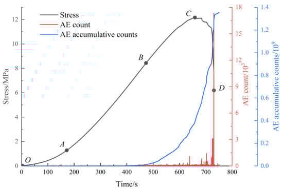Stress, AE count, and AE accumulative counts versus time curve during loading process. OA: initial compaction stage; AB: linear elastic stage; BC: elastic-plastic stage; CD: post-peak failure stage.