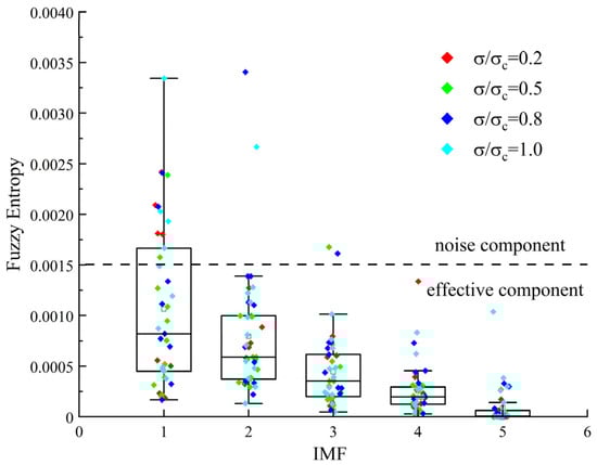 To reduce the computational load associated with the high sampling frequency and large number of AE signal data, 100 sets of data are selected at equal intervals from the time sequence. Each data set consists of 1024 sampling points. The FCI-VMD algorithm is applied to decompose each set of signals, simultaneously calculating the fuzzy entropy of the resulting IMF components. Figure 10 illustrates the decomposition results and the corresponding fuzzy entropy values. In the figure, σ represents stress; σc represents peak stress; and σ/σc represents different stress stages. It can be observed that the optimal decomposition level for the AE signal is 5, and there is a significant variation in fuzzy entropy among the IMF components. The fuzzy entropy values are arranged in descending order, with IMF1 exhibiting the highest entropy, and IMF5, the lowest. This suggests that IMF1 contains a greater proportion of noise signal components, and each layer of IMF components contains noise modes. In this study, components with fuzzy entropy exceeding a certain threshold are filtered out, while the remaining components are reconstructed to obtain the effective signals. This approach avoids filtering out only IMF1 or selectively filtering out some effective signals, thereby preventing the presence of residual noise in the reconstructed signals. Based on statistical analysis of the fuzzy entropy values of each IMF component, it is observed that the IMF component displays relative discreteness when fuzzy entropy exceeds 0.015. Hence, a threshold of 0.015 is set in this study.