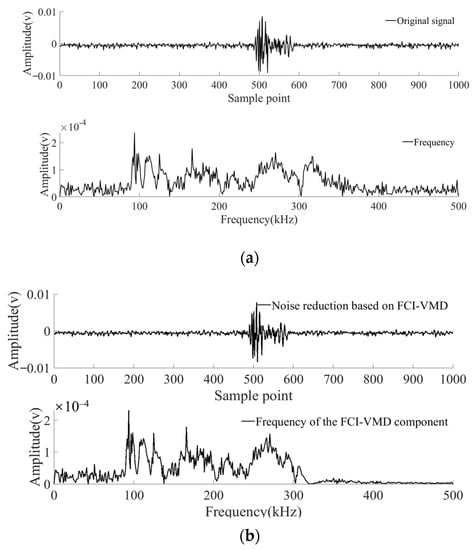 Waveform and spectrum of noise-containing coal AE signals. (a) Original signal. (b) Signal after noise reduction.