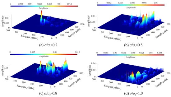 Time–frequency analysis is a signal analysis method that transforms time-domain signals into time–frequency images. It describes the spectral components of the signal at different times, so it contains more information []. In this paper, the Hilbert transform is used to convert the denoised one-dimensional time-domain signal into a three-dimensional time–frequency image, and the spectrum of typical AE signals in the four stages is selected, as shown in Figure 12.