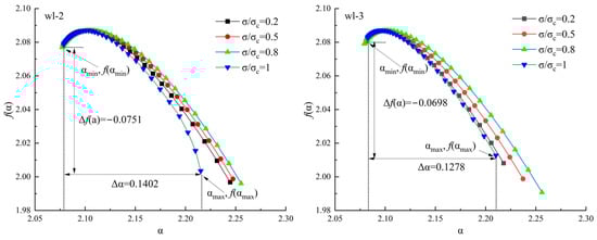 where f(αij) represents the probability of a in all singularity index sets, also known as the fractal dimension, when the singularity index is . The multifractal spectrum is formed by plotting all in the Cartesian coordinate system, which can reflect the inhomogeneity of the acoustic emission spectrum. The width of the multifractal spectrum of Δα is defined as follows:
