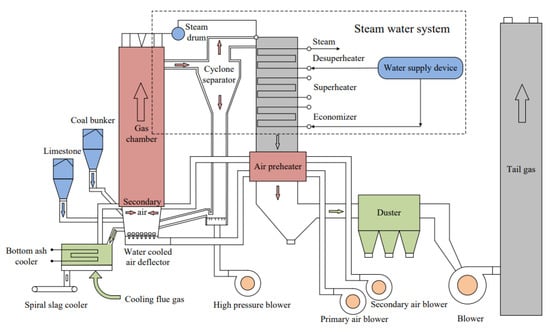 - Vaporization process: It is the process of steam generation, including water cycle and steam–water separation. The chemically treated water is deoxygenated by the deaerator and preheated by the economizer to enter the drum. The CFB boiler process flow is shown in Figure 4.
