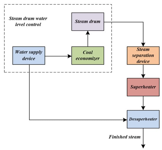 The main control goal of the steam–water system of the CFB boiler is to track the steam load requirements according to the feed water flow of the boiler, control the steam temperature within a certain range, and ensure the safe, stable, and energy-saving operation of the boiler and turbine. According to the characteristics of the steam–water system, it can be controlled in two aspects, that is, the drum water level control and main steam temperature control. In the steam–water system of the CFB boiler (in the dotted box of Figure 4), water flows out from the water supply device, and the steam drum is removed after moderate heating by the economizer. In addition, the water supply device also supplies water to the desuperheater, so that the temperature change of the main steam is not too large. The main steam passes through the steam–water separation device and the superheater, and finally becomes the finished steam through the desuperheater [28,29]. Figure 5 is a simplified flow chart of the steam–water system in the dotted box in Figure 4 [21].