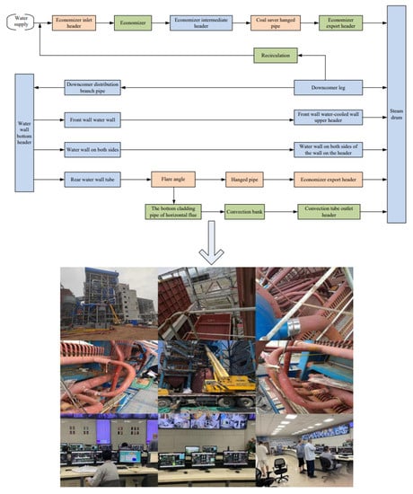 The feedwater in the economizer is preheated by the flue gas before being introduced into the steam drum’s water space. At this point, the boiler water, located at the top of the boiler, flows downward through downcomer pipes outside the furnace due to its own weight. After entering the water-wall tubes through the lower header box, the boiler water undergoes heat absorption and vaporization. During this period, a large amount of steam–water mixture forms in the drum, while the simultaneous separation of the steam and water occurs. The aforementioned water-wall tubes are laid around the furnace and are commonly referred to as upcomers. Subsequently, the boiler water circulates and vaporizes continuously within the downcomer pipes, upcomers, and drum. The saturated steam accumulated in the upper part of the drum passes through the superheater, where it is continually heated, ultimately becoming superheated steam. Finally, the superheated steam enters the main steam pipeline and goes into the turbine. The specific operation process is shown in the following Figure 6.