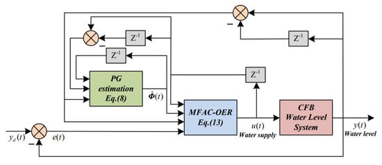 In this experiment, with the parameters , , the model is only used to provide input and output data. Given the reference signal ; the MFAC and MFAC-OER controller parameters are set to , , , , , , , . The PID controller parameters are set to , , . The MFAC-OER drum water level simple control block diagram is shown in Figure 7.