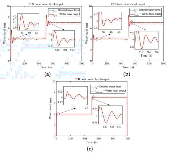 Three control methods’ system water level output curves: (a) PID water level output curve; (b) MFAC water level output curve; and (c) MFAC-OER water level output curve.