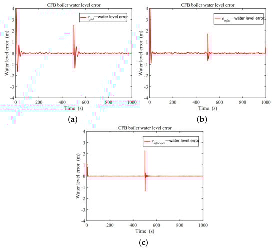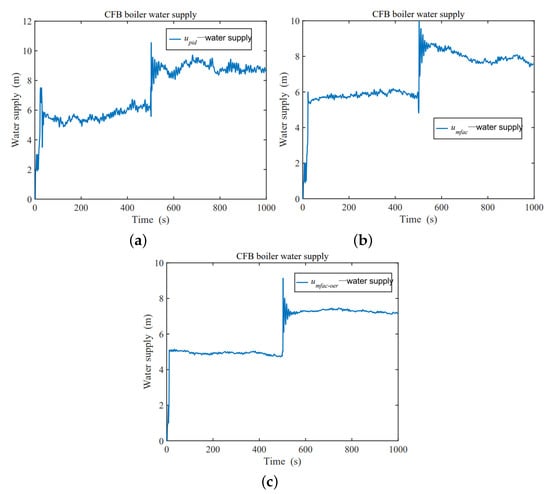 Figure 10 shows the water supply input change curves of the MFAC-OER, MFAC, and PID methods, which reflects the input stability. Stable control input change can reduce the energy loss and daily maintenance cost. It is not difficult to see that the water supply maintained by the MFAC-OER method has been in a reasonable working range. The water supply is always stable at 5 m from 0 s to 500 s and 7 m from 500 s to 1000 s, with little change. When the working condition changes (500 s), it can also respond quickly; in MFAC and PID, the water supply of 6 m from 0 s to 500 s and the water supply of 9 m from 500 s to 1000 s has been in a large fluctuation process, which is greatly affected by interference and is prone to being large or even small. If it is too high, exceeding the normal water level will lead to problems in the steam–water separation process; an excessively low water level will lead to an abnormal water cycle. In addition, the frequent adjustment of the water supply will also lead to a greater loss of system components. After a long period of operation, it is proven that the MFAC-OER method of the CFB water level has the following advantages: stable drum water level, sensitive control, high safety and reliability, effectively avoiding the interference of internal and external disturbance factors, and meeting the control requirements.