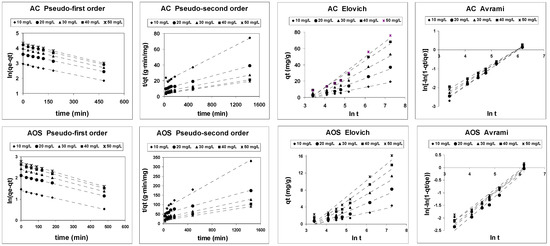 | Pseudo-First Order | Pseudo-Second Order | Elovich | Avrami | ||||||||||