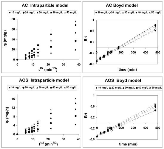 | Weber-Morris [52] | qt against t1/2 | kintp: intraparticle diffusion rate constant (mg/g·h1/2) Ci: contribution of the boundary layer diffusion | |