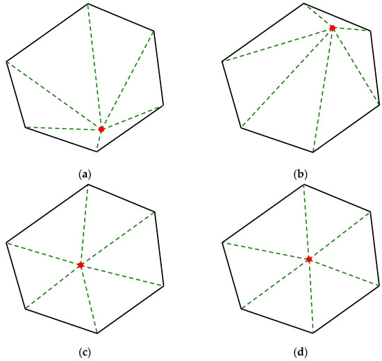 Impact of the central node moving position on node quality. (a) Case 1, where the central node moves near the polygon boundary; (b) Case 1, where the central node moves near the polygon boundary; (c) Case 2, where the central node moves near the center of the polygon; (d) Case 2, where the central node moves near the center of the polygon.