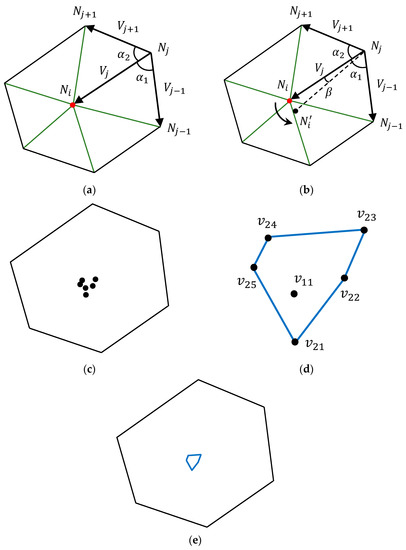 The inner polygon is constructed based on the angle-based smoothing method proposed by Zhou and Shimada [14]. As shown in Figure 3a, is the central node of the polygon, and is the adjacent point of the polygon. denotes , denotes , and denotes . is the angle formed by , and , and are the angles formed by and . With as the center and as the radius, is rotated until the included angle formed by and equals to that formed by and . The angle to be rotated is , and the updated central node is shown in Figure 3b. The central node has a total of adjacent points, so when the same operation is performed times, central nodes are generated inside the polygon after one round of the operation, as shown in Figure 3c.