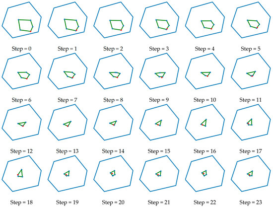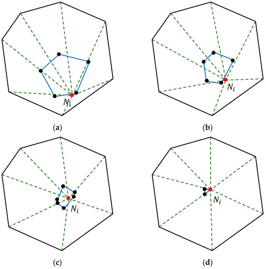 The size and position of the inner polygon change constantly during the smoothing process. As shown in Figure 6, when the node quality is low, the area formed by the inner polygon is large and close to the polygon boundary. As the number of iterations increases, the quality of nodes improves, the area formed by the inner polygon starts to shrink, and the position moves to the central area. When the node quality is high, the position of the inner polygon is close to the center of the polygon. The central node finally moves in the center area to improve the node quality.