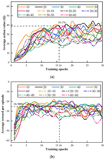 The structure of the Q-network changes depending on the number of hidden layers and the number of neural units. In this paper, we set the number of hidden layers to one and two, and the number of neural units with one hidden layer is 10, 20, 30, 40, 50, and 60. Q-networks with two hidden layers are set with the same number of neural units in the hidden layers and fully connected between the two hidden layers. Q-networks with different structures are used to train the dataset. The numerical convergence of the average Q-value and the average reward with the number of training rounds is output after the training is completed. The convergence using different Q-networks for training is shown in Figure 8.