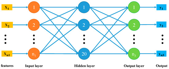 The total number of layers in the neural network is two—the first is hidden, and the second is an output layer. The state space of the dataset is used as the input, and the number of neural units in the input layer is , where the central node needs to be recorded as a feature, is the number of polygon nodes, and is the number of inner polygon nodes. The number of neural units in the hidden layer is . The action space of the dataset is taken as the output, and the number of neural units in the output layer is . The structure of the neural network is shown in Figure 9.