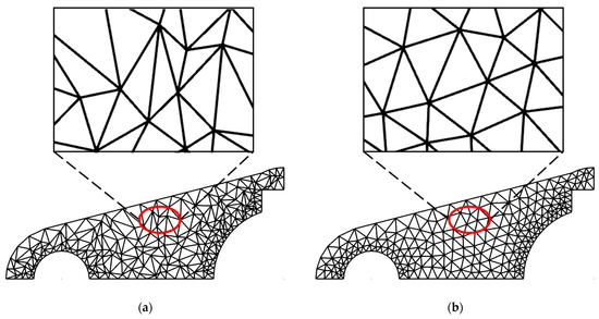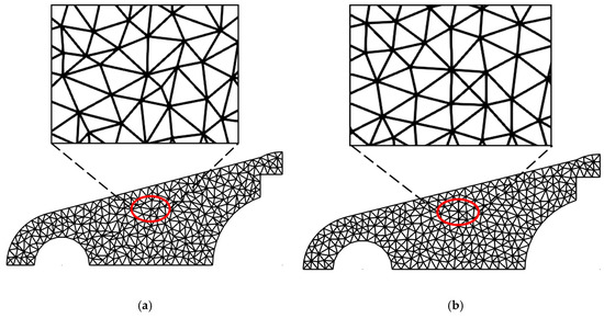 Numerical mesh generation is a preprocessing step in finite element analysis. Mesh generation is the basis of finite element calculations, and high-quality meshes are critical to the results of finite element calculations [1]. Delaunay triangulation is one of the most general automatic finite element mesh generation methods [2]. Due to the influence of internal node insertion, boundary constraints, element size transition, and other factors, the initial mesh formed using the Delaunay triangulation algorithm will have poor elements in local areas. These poor elements will affect the accuracy and efficiency of the finite element calculation [3]. For example, larger element angles lead to larger gradient errors, while smaller angles significantly increase the stiffness matrix condition [4,5], which reduces the solution accuracy and convergence of the iterative solvers. Thus, mesh smoothing is required to improve mesh quality after finite element mesh generation [6].
