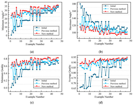 In the data statistics, the aspect ratio and maximum/minimum angle are used to evaluate the mesh quality, reflecting the optimization effect of the constrained DQN on poor element angles. Ref. [5] showed that the stiffness matrix condition depends on the element’s shape, and elements with small angles will lead to poor matrix conditions, proving that the minimum angle can be used as an index to evaluate the mesh quality.