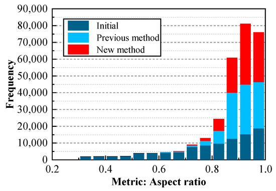 The optimization effect for low-quality elements also needs to consider the number of poor elements after optimization. First, there are no elements with a quality of less than 0.5 in the initial mesh. Second, elements with aspect ratio values of less than 0.8 are called low-quality elements. In summary, to investigate the optimization effect of the proposed method for low-quality elements, all elements of the four examples were taken as a whole, and the distribution of element quality between 0.5 and 0.8 was counted; the results are shown in Figure 24. It can be seen that the proposed method has the lowest number of poor elements after optimization, which also shows the advantage of the algorithm in improving the quality of poor elements in this paper.