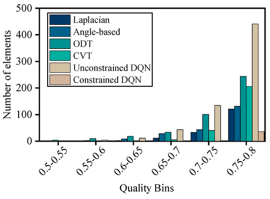 An Intel Core i7-4710MQ 2.50 GHz CPU with 16 GB of memory and a Windows 10 operating system was used. The constrained DQN model was based on Python, and the neural network framework used TensorFlow 1.15.0. Fewer neural network layers were used, so it ran faster. Forty finite element mesh models were studied, training was performed 16 times, and the total training time was approximately 6 h. The Laplacian, angle-based, ODT, CVT, and unconstrained DQN methods as well as the constrained DQN were used for comparison. The Laplacian, angle-based, ODT, and CVT methods adopt the results after ten iterations. Both unconstrained and constrained DQN models were trained using the same dataset.