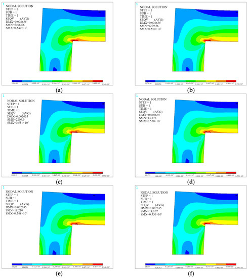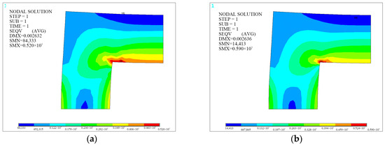 The initial, overall refined, and optimized mesh of the proposed method for Example 1 is shown in Figure 26. The comparison results of different methods are shown in Table 5. It can be seen that the proposed method is significantly better than the other methods for angle control. Since there is no analytical solution for the L-shaped plate, we used the finite element calculation results of the refined mesh, as shown in Figure 26b, as the reference solution for comparison. The stress nephograms for the initial and refined meshes of Example 1 are shown in Figure 27. The stress nephograms after optimization using the remaining optimization methods are shown in Figure 28.