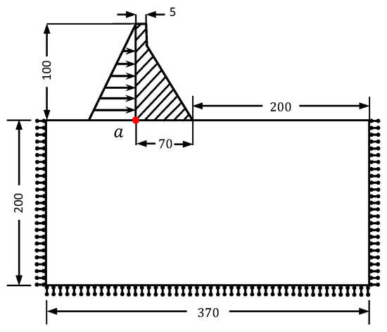 In this section, the gravity dam model in [30] is chosen for the calculation example. The model contains two parts: the dam and foundation; the specific geometry and load form are shown in Figure 29. The dam body’s height is 100 m, the top length is 5 m, the bottom length is 70 m, the capacity is 2400 N/m3, elasticity E = 21 GPa, and the Poisson’s ratio μ = 0.167. The calculated depth of the dam foundation is 200 m, the length is 370 m, the capacity is 2500 N/m3, elastic modulus E = 20 GPa, and the Poisson’s ratio μ = 0.17.