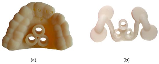 Thirty mini-implants were placed using full-arch guides (from Easy Driver, Uniontech, Parma, Italy) (Figure 2a), and thirty using skeletonized templates fabricated in-house using Blender software (Blender Foundation, Amsterdam, The Netherlands) and an SLA-printer (Form 3, Formlabs Inc., Berlin, Germany) (Figure 2b).