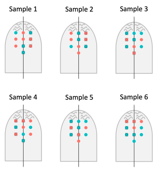 Graphical representation of the randomization process. In orange: full-arch insertion template; in green: skeletonized insertion template; x: pre-drilling.