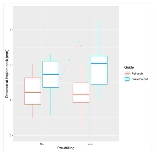 The distance between the planned and the real position of the mini-implant neck is reported in Figure 4. The highest mean deviation at the implant neck was 2.09 ± 0.92 mm, recorded in the skeletonized/pre-drilling group. The Kruskal–Wallis test revealed a statistically significant difference between the four groups (p = 0.012). Therefore, a post hoc test was conducted, and corrected p values are reported in Table 2. Deviations at the neck were statistically higher in the skeletonized guides with pre-drilling as compared to full-arch guides with pre-drilling. No other significant differences were observed among the groups.
