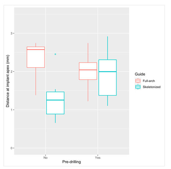The deviation between the planned and the real position of the mini-implants was analyzed also at their apex, with median values above 1 mm in all groups (Figure 5). At the apex, the highest deviation was of 3.04 ± 1.44 mm and was registered in the full-arch/no pre-drilling group, while the lower mean deviation of 1.72 ± 1.22 mm was observed in the skeletonized/no pre-drilling one. No statistically significant difference was found between the four groups, as revealed by the Kruskal–Wallis test (p = 0.131).