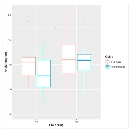 Finally, the angle between the planned and the real position of each mini-implant was measured (Figure 6). The lower mean angular deviation was of 8.23 ± 4.24° and was registered in mini-implants inserted using a skeletonized guide without a pre-drilling procedure, while in all the other groups, the mean angular deviation was higher than 11°. Even for this variable, it was not possible to find a statistically significant difference between the four groups (p = 0.511). Further details on descriptive statistical analysis are provided in Table 3.
