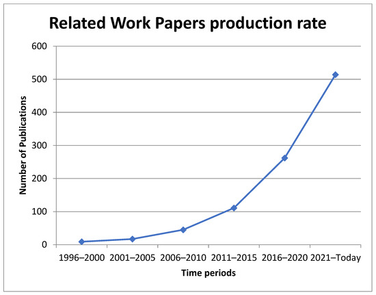 For this paper, we studied and analyzed the existing literature on the fields of monitoring and the IoT. We realized that the usage of monitoring in general and its combination, specifically with the IoT, became more vital over the years. Thus, the rising number of studies suggests that more study is needed in this field. Figure 1 illustrates the explosive growth of papers addressing monitoring and concerns regarding the IoT. As we can see, compared to the prior decade, scholars’ interest has significantly expanded over the past seven years. As we can observe in the first step of the diagram, the interest of the papers engaged in this field was very low, and on the other hand, after ten years of research and the advancement of technology, we realized that both investigations and interest increased significantly. However, the rapid development of the IoT, as it is perceived by its use in industry, has contributed to this.