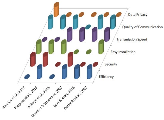 More specifically, Figure 2 explicitly displays the contribution of six articles that suggested monitoring architectures based on CC and IoT technology. The selected and related work papers proposed novel paradigms, which we distinguished from the set of the whole related research papers we have studied. Each column represents a piece of paper, and each color represents a characteristic of the IoT (Data Privacy, Quality of Communication, Transmission Speed, Easy Installation, Security, Efficiency) [6,10,61,62,63,64]. Also, Figure 2 shows that the majority of architecture proposals address the quality of communication. It also becomes clear that little research was conducted in the area of data security and privacy. Therefore, these are the fields that present the chance for further research. Moreover, we have to state the choice of the specific six works instead because they were considered the most relevant and closest to our research and the part that we are studying in this particular work. Also, the specific six works have several citations and a great impact on the specific field we studied in this work.