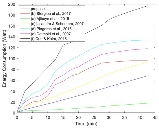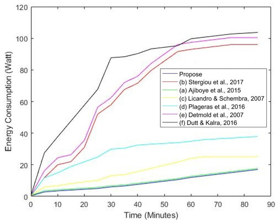 Energy Consumption Comparison (Consumption in/Time in minutes) (scenario D) [6,10,61,62,63,64].