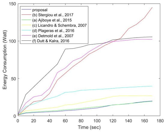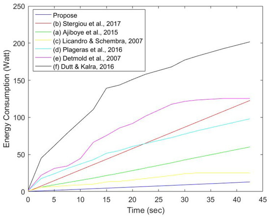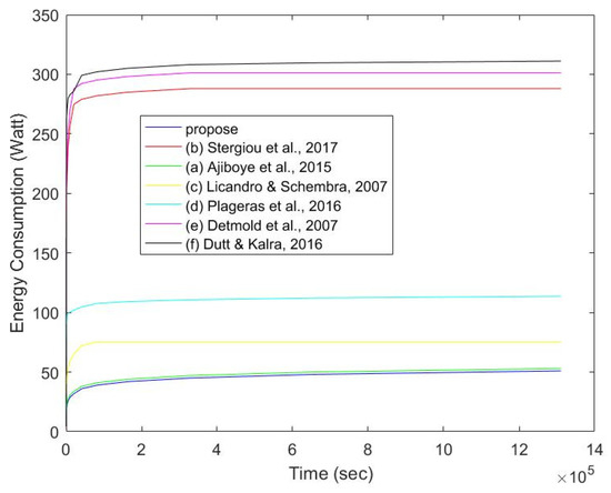 Energy Consumption Comparison (Consumption in/Time in seconds) (scenario E) [6,10,61,62,63,64].